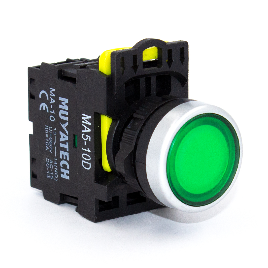 Yeşil 220V Işıklı Yaylı Start Butonu (1NO Kontaklı) - Muyatech MA5-10D